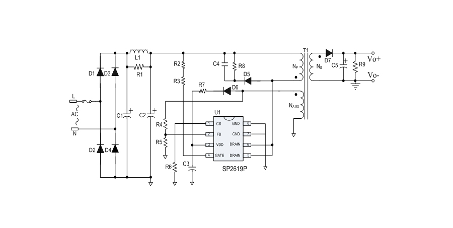 SP2619P 提供全面的保護(hù)功能,包括逐周期限流保護(hù)(OCP)、VDD 過(guò)壓保護(hù)(OVP)、VDD 欠壓保護(hù)(UVLO)、反饋環(huán)路開(kāi)路保護(hù)、輸出短路保護(hù)、輸出過(guò)壓保護(hù)、過(guò)溫保護(hù)等。其中,輸出短路保護(hù)、輸出過(guò)壓保護(hù)具有自動(dòng)重啟恢復(fù)的功能。