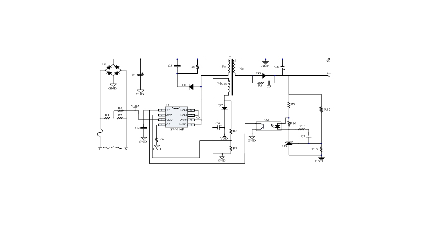 SP6616P是一顆電流模式PWM控制芯片,內(nèi)置650V高壓功率MOSFET,應(yīng)用于功率在13W以內(nèi)的方案。SP6616P在PWM模式下工作于固定開關(guān)頻率,這個頻率是由內(nèi)部精確設(shè)定。在空載或者輕載時,工作頻率由IC內(nèi)部調(diào)整。芯片可以工作在綠色模式,以此來減小輕載時的損耗,提高整機(jī)的工作效率。SP6616P在啟動和工作時只需要很小的電流,可以在啟動電路中使用一個很大的電阻,以此來進(jìn)一步減小待機(jī)時的功耗。芯片內(nèi)置有斜坡補(bǔ)償電路,當(dāng)電路工作于大占空比時,避免次諧波振蕩的發(fā)生,改善系統(tǒng)的穩(wěn)定性。內(nèi)置有前沿消隱時(Leading-edge blanking time),消除緩沖網(wǎng)絡(luò)中的二極管反向恢復(fù)電流對電路的影響。SP6616P采用了抖頻技術(shù),能夠有效改善系統(tǒng)的EMI性能。系統(tǒng)的跳頻頻率設(shè)置在音頻(20KHz)以上,在工作時可以避免系統(tǒng)產(chǎn)生噪音。SP6616P內(nèi)置多種保護(hù),包括輸出過壓保護(hù)(VOUT OVP),逐周期限流保護(hù)(OCP),過載保護(hù)(OLP),過壓保護(hù)(VDD OVP),VDD過壓箝位,欠壓保護(hù)(UVLO),過溫保護(hù)(OTP)等,通過內(nèi)部的圖騰柱驅(qū)動結(jié)構(gòu)可以更好的改善系統(tǒng)的EMI特性和開關(guān)的軟啟動控制。