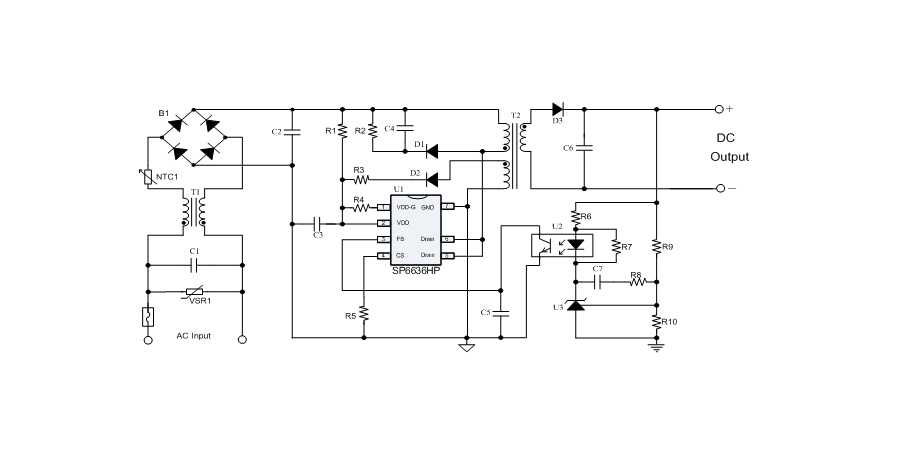 SP6636HP是一顆電流模式PWM控制芯片,內置功率MOSFET,用于功率在12W以內的方案。該芯片在系統輸出空載時工作在跳頻模式,在系統輸出輕載到中等負載階段工作在PFM模式,在輸出重載時工作在最大恒定工作頻率。SP6636HP的啟動電流和工作電流設定的比較小,以此減小待機時的功耗。芯片內置有斜坡補償電路,避免次諧波振蕩的發生,改善系統的穩定性。芯片內置有前沿消隱時間(Leading-edge blanking time),消除緩沖網絡中的二極管反向恢復電流對電路的影響。該芯片帶有抖頻功能,能夠有效改善系統的EMI性能。芯片最低的工作頻率設置在音頻以上,在工作時可以避免系統產生噪音。SP6636HP內置多種保護,包括逐周期限流保護(OCP),過壓保護(OVP),VDD過壓箝位,欠壓保護(UVLO),過溫保護(OTP)等,通過內部的圖騰柱驅動結構可以更好的改善系統的EMI特性和開關的軟啟動控制。