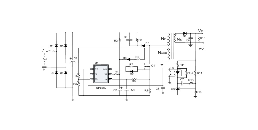 SP6660是一顆高性能、多工作模式的PWM控制芯片。芯片可以工作在跳頻及綠色模式,以此來減小空載和輕載時的損耗,也可以工作在QR工作模式及CCM工作模式,提高整機(jī)的工作效率。SP6660在啟動和工作時只需要很小的電流,可以在啟動電路中使用一個很大的電阻,以此來進(jìn)一步減小待機(jī)時的功耗。SP6660內(nèi)置多種保護(hù),包括:輸入電壓過低保護(hù)(Brown-out),輸入電壓過高保護(hù)(Lineovp),輸出電壓過壓保護(hù)(VO_OVP),輸出二極管短路保護(hù),逐周期過流保護(hù)(OCP),過載保護(hù)(OLP),VDD過壓保護(hù)(OVP),VDD欠壓保護(hù)(UVLO),過溫保護(hù)(OTP)等。