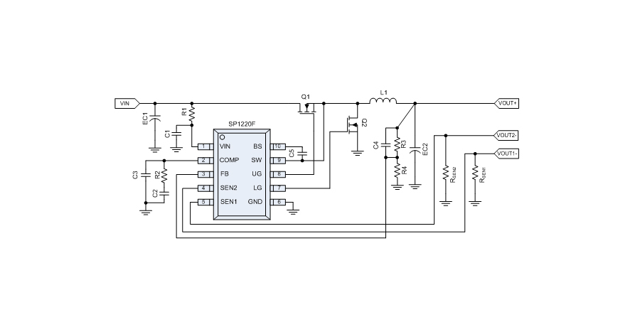 SP1220F是一款同步降壓型PWM控制器,該控制器可驅(qū)動雙路輸出8A(4A+4A)負(fù)載電流。設(shè)計允許SP1220F在9V到40V寬輸入電壓范圍內(nèi)工作。通過將COMP/EN引腳邏輯電平拉低來實(shí)現(xiàn)外部關(guān)斷功能,并進(jìn)入待機(jī)模式。外部補(bǔ)償使反饋控制環(huán)路具有良好的線壓調(diào)整率和負(fù)載調(diào)整率,且外圍設(shè)計靈活。