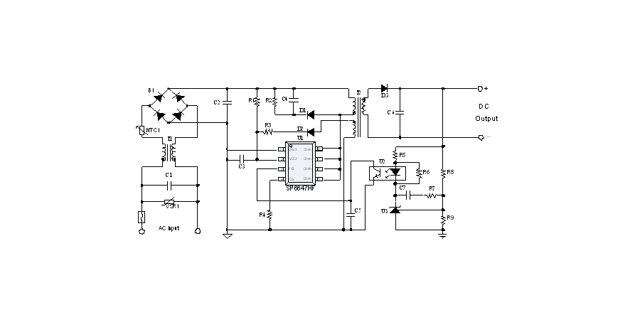 SP6647HF是一顆電流模式PWM控制芯片,內置650V高壓功率MOSFET,應用于功率在15W以內的方案。SP6647HF在PWM模式下工作于固定開關頻率,這個頻率是由內部精確設定。在空載或者輕載時,工作頻率由IC內部調整。芯片可以工作在綠色模式,以此來減小輕載時的損耗,提高整機的工作效率。SP6647HF在啟動和工作時只需要很小的電流,可以在啟動電路中使用一個很大的電阻,以此來進一步減小待機時的功耗。芯片內置有斜坡補償電路,當電路工作于大占空比時,避免次諧波振蕩的發生,改善系統的穩定性。內置有前沿消隱時(Leading-edge blanking time),消除緩沖網絡中的二極管反向恢復電流對電路的影響。SP6647HF采用了抖頻技術,能夠有效改善系統的EMI性能。系統的跳頻頻率設置在音頻(22KHz)以上,在工作時可以避免系統產生噪音。SP6647HF內置多種保護,包括逐周期限流保護(OCP),過載保護(OLP),過壓保護(VDD OVP),VDD過壓箝位,欠壓保護(UVLO),過溫保護(OTP)等,通過內部的圖騰柱驅動結構可以更好的改善系統的EMI特性和開關的軟啟動控制。