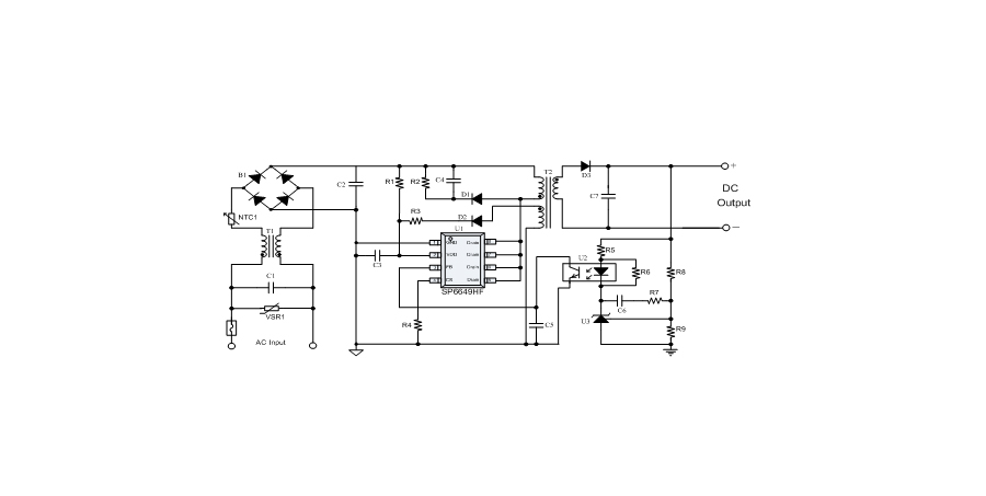 SP6645HF是一顆電流模式PWM控制芯片,內置650V高壓功率MOSFET,應用于功率在13W以內的方案。SP6645HF在PWM模式下工作于固定開關頻率,這個頻率是由內部精確設定。在空載或者輕載時,工作頻率由IC內部調整。芯片可以工作在綠色模式,以此來減小輕載時的損耗,提高整機的工作效率。SP6645HF在啟動和工作時只需要很小的電流,可以在啟動電路中使用一個很大的電阻,以此來進一步減小待機時的功耗。芯片內置有斜坡補償電路,當電路工作于大占空比時,避免次諧波振蕩的發生,改善系統的穩定性。內置有前沿消隱時(Leading-edge blanking time),消除緩沖網絡中的二極管反向恢復電流對電路的影響。SP6645HF采用了抖頻技術,能夠有效改善系統的EMI性能。系統的跳頻頻率設置在音頻(22KHz)以上,在工作時可以避免系統產生噪音。SP6645HF內置多種保護,包括逐周期限流保護(OCP),過載保護(OLP),過壓保護(VDD OVP),VDD過壓箝位,欠壓保護(UVLO),過溫保護(OTP)等,通過內部的圖騰柱驅動結構可以更好的改善系統的EMI特性和開關的軟啟動控制。