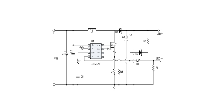 SP5521F提供完善的保護功能,包括輸入電壓欠壓保護(UVLO)、逐周期的功率管過流保護(OCP)、過溫保護(OTP)。