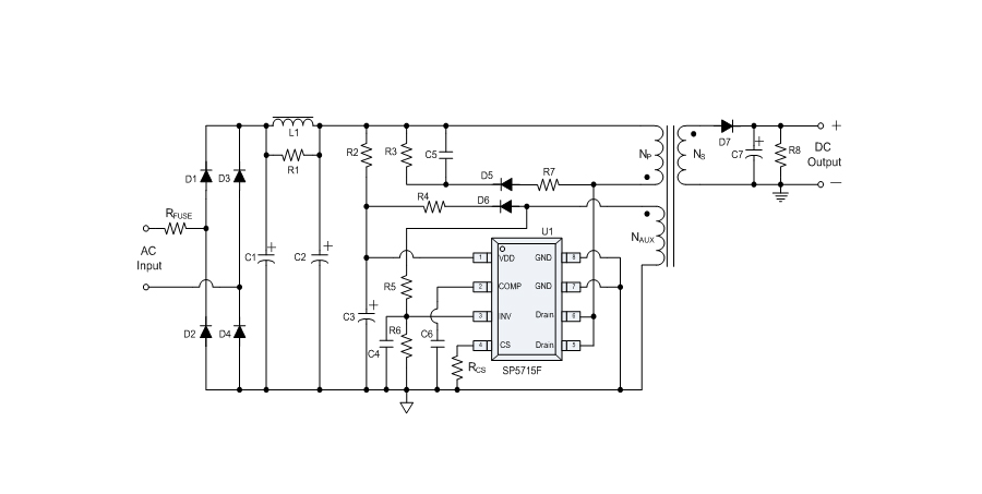 SP5715F是一顆高精度離線式開關(guān)電源電路,應(yīng)用于低功耗AC/DC充電器與適配器。SP5715F使用原邊取樣來進(jìn)行精確的恒流、恒壓控制,可以省去一般應(yīng)用中的光耦與TL431。