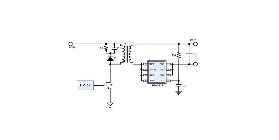 SP6552FL檢測(cè)內(nèi)置MOSFET的導(dǎo)通電阻(Rds-on)上的壓降,來(lái)控制MOSFET的開(kāi)關(guān)。應(yīng)用外圍簡(jiǎn)單。固定用于5V輸出的應(yīng)用方案。