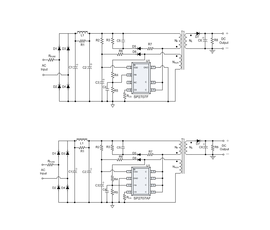 SP2707F采用SOP7無鉛封裝;SP2707AF采用SOP8無鉛封裝。