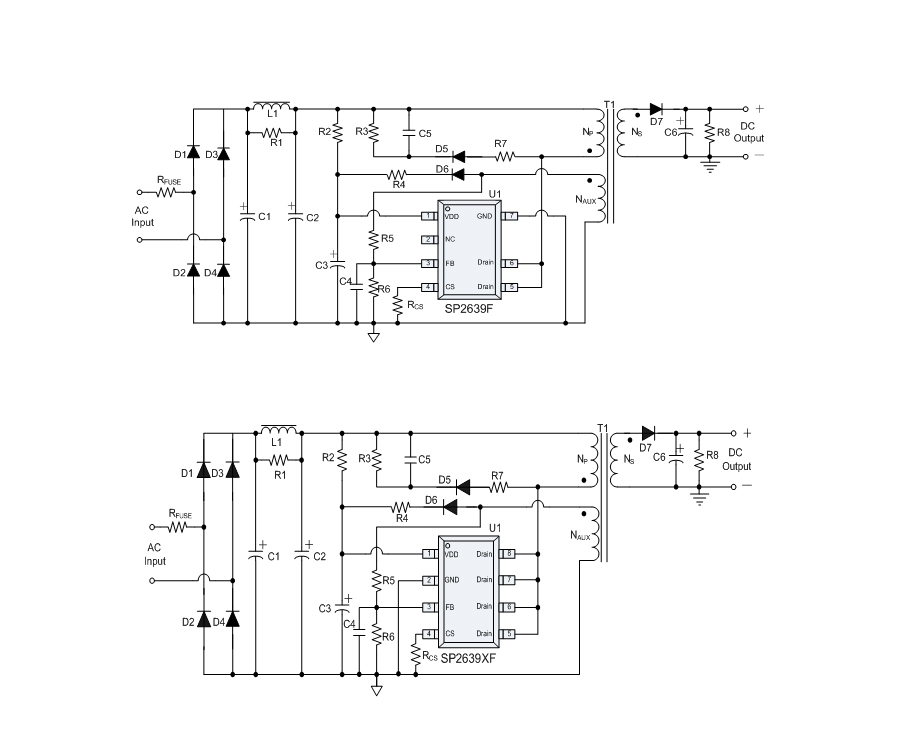 SP2639AF是一款性能優異的原邊反饋控制電路,應用于小功率AC/DC充電器與適配器。控制電路使用原邊采樣技術進行精確的恒流、恒壓控制,可以省去一般應用中的光耦與TL431。