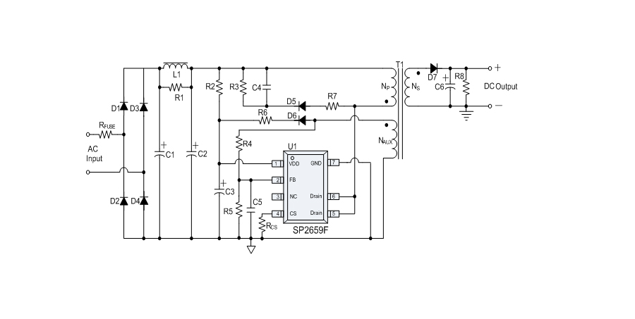 SP2659F提供全面的保護功能,包括逐周期限流保護(OCP)、VDD過壓保護(OVP)、VDD欠壓保護(UVLO)、反饋環路開路保護、輸出短路保護、輸出過壓保護、過溫保護等。其中,輸出短路保護、輸出過壓保護具有自動重啟恢復的功能。