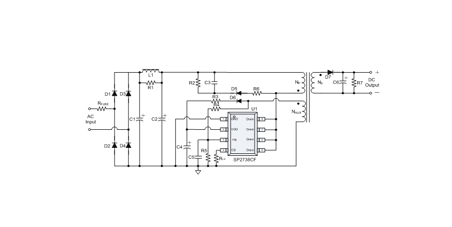SP2738CF是一款性能優(yōu)異的原邊反饋控制電路,應(yīng)用于中、小功率AC/DC充電器與適配器。控制電路使用原邊采樣技術(shù)進行精確的恒流、恒壓控制,可以省去一般應(yīng)用中的光耦與TL431。